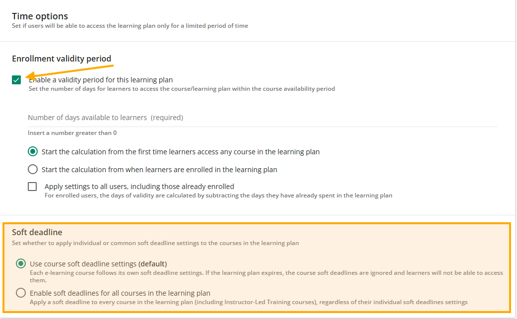 • Learners can continue accessing and completing a course after the soft deadline, provided the Learning Plan is still active.